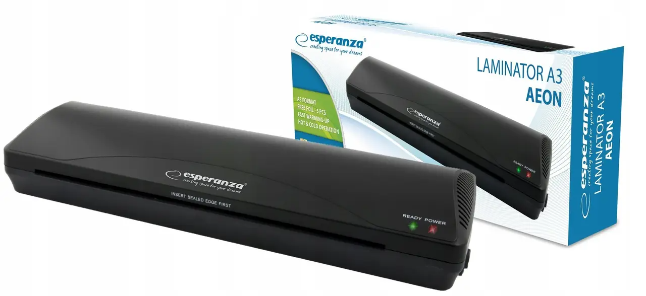 Ламінатор Esperanza AEON - пристрій, який буде працювати як вдома, так і в невеликому офісі. Він безпечний і простий у використанні. Миттєво ламінуйте документи розміром до A3, гарячим або холодним. Ламінатор швидко і зручно захистить важливі документи, фотографії, ескізи або малюнки на тривалий час. Його сучасний дизайн впишеться в будь-який інтер'єр будинку або офісу.